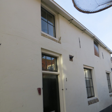 Hoekpand Eendenhoeksteeg (XVII ?) met hoog schilddak en gepleisterde lijstgevel (XIX).