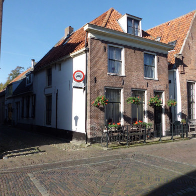 Hoekpand gasthuissteeg (XVII) met schilddak, waarin dakvenster. Voorgevel XIX B, zijgevel, waarin schuiframen in stijl XVIII met luiken.