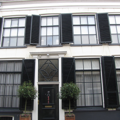 Huis met lijstgevel, zeven vensters breed; parterre met verdieping. Deur ca. 1800, schuiframen, kroonlijst op fijn gesneden consoles.
