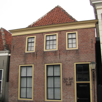 DWARSHUIS waarvan de lijstgevel een geheel vormt met die van nr. 15. Schuiframen. Jaartalsteen: 1595. Zadeldak.