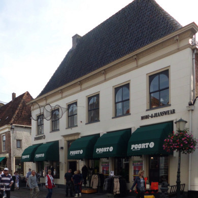Monumentaal huis op hoek Smeesteeg. Circa 1600, verbouwd in het eerste kwart van de negentiende eeuw: deftige gevel met kroonlijst, gesneden deur met bovenlicht. Raamsponningen met waaiermotieven in de zwikken. Twee stoephekken met rolwerkversiering uit het eerste kwart van de zeventiende eeuw. Schuiframen.