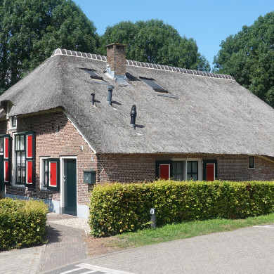 Boerderij, midden 19e eeuw, onder rieten wolfdak en met in de voorgevel vensters met luiken en 20- en 9- ruitsschuiframen.