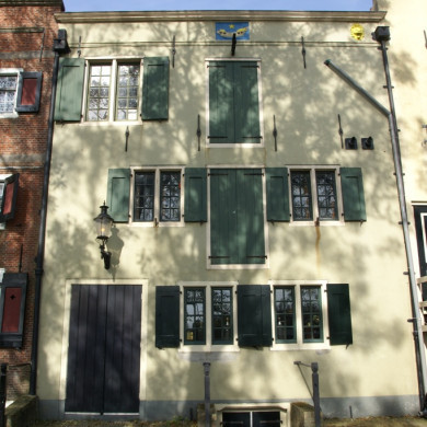 Hoog pakhuis zeventiende eeuw waarvan de trapgevel gepleisterd is; achter eveneens topgevel; gekoppelde luiken en vensters in voorgevel. In ankers gedateerd 1565 (?)