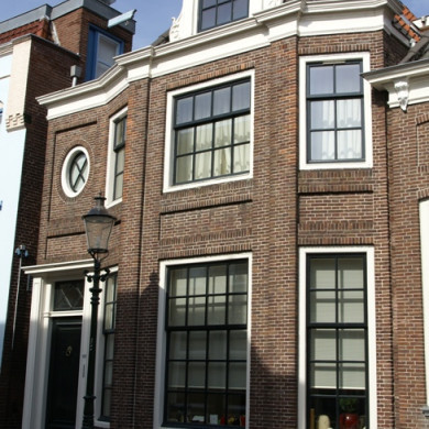 Laag 18e eeuws achterhuis; snijwerk langs dakkapel; 18e eeuwse roeden in de vensters en bovenlicht.