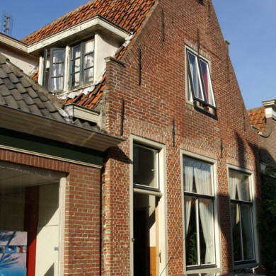 Laat 16e eeuws pand in de bakstenen gevel waarvan de bovenste top verloren is, gedateerd 1592. Twee treden van de gevel met klimmende pilasters. Inwendig houten binnenpoortje met fronton naar in hout overwelfde gang.