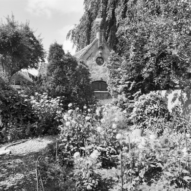 v.m.Schuilkerk Doopsgezinden. Pand onder zadeldak tussen puntgevels waarvan een der beide korte gevels wordt bekroond door een schoorsteen met een windwijzer in de vorm van een koe, bevat verder een gietijzeren roosvenster.