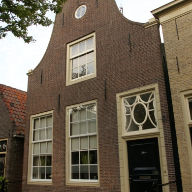 Laag dwarshuis met dakkapel; gesneden deur met rococo-ornament, XVIII.