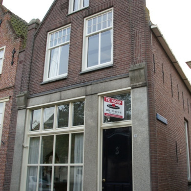 Pand met laat 18e eeuwse gevel met hoeklisenen en rechte kroonlijst en dakkapel voor diep 17e eeuws pand. Achtertopgevel gepleisterd. Vensters met middenstijl. Gesneden deur, geprofileerd kalf en aardig bovenlicht.
