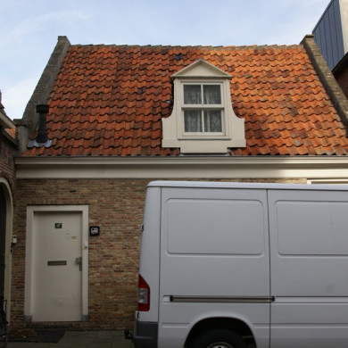 Tot pakhuis gedegradeerd pandje onder zadeldak tussen topgevels.
