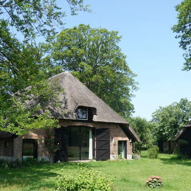 BOERDERIJ, in oorsprong wellicht XVIII, met fraai rieten wolfdak en gepleisterde voorgevel, waarin vensters met goede roedenverdeling in de ramen. Houten schuur en twee roedenbergen.