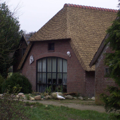 Goed bewaarde boerderij in gave landschappelijke omgeving (XIX A). Strodak, vensters met luiken en negenruitsschuiframen in de voorgevel.