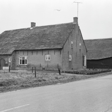 Rieten dak met rechtopstaand verbindingsstuk tussen woonhuis en stal; de stal heeft een hogere nok. Grote schuur met geteerde planken wanden en rieten dak.