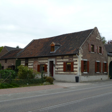 Hoeve van baksteen, gelegen aan een binnenplaats. XVIII B. Voorgevel gepleisterd. Inrijpoort onder luifel.