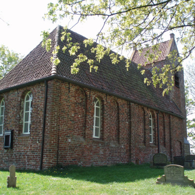 N.H.Kerk en toren op verhoogd kerkhof. Rechtgesloten kerkje grotendeels uit de 13e eeuw met dwarsgebouwde zadeldaktoren uit de 14e eeuw. In de kerk eenvoudige preekstoel met klankbord en herenbank met snijwerk waarin wapen is gevat. Twee 16e eeuwse zerken. Klokkenstoel met klok van Henrik (Kokenbacker?), 1466, diam. 95,6 cm.