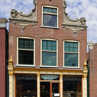 Pand onder zadeldak tegen fraaie halsgevel met gebeeldhouwde hoekstukken in régence-trant met opschrift: ANNO 1745, binnenplaats en tussenlid, achterhuis.