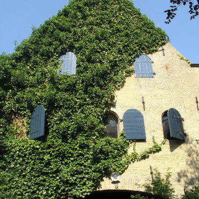 In het benedendeel de gevel nog slechts een rondbogige opening en een negenruitskozijn.