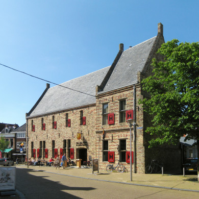 Hoog oprijzende voorbouw, gedekt door dwarshek tussen topgevels waarboven forse hoekschoorstenen met borden. XIX A.