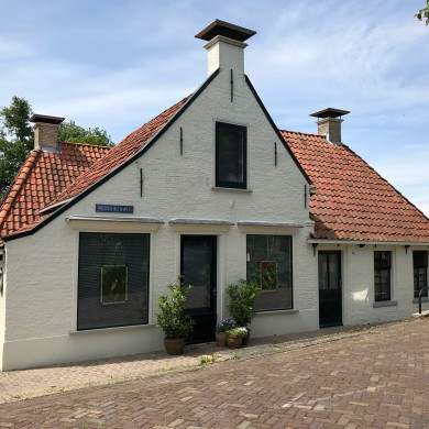 Breed landelijk pand onder schilddak met twee hoekschoorstenen.
