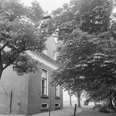 Tegenover de kerk gelegen dubbel pand onder zadeldak tussen topgevels.