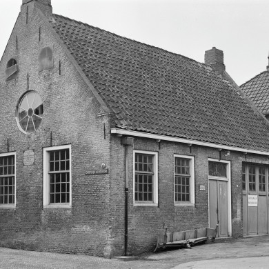 Voormalig schoolgebouw uit 1830, onder zadeldak tussen topgevels.