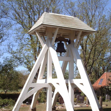 Op het kerkhof een klokkenstoel met schilddak.