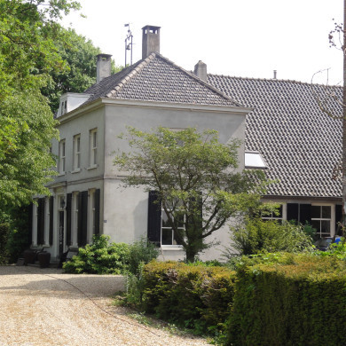 Gepleisterde boerderij op T-vormige plattegrond, naast de poorttoren van Poelwijk. Eerste steen gelegd 1864.