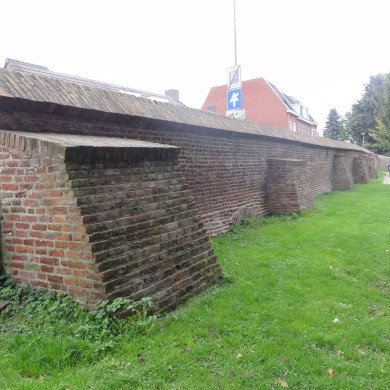 Resten van de versterkingen der in 1371 voor het eerst als zodanig vermelde stad; gedeelten van de aarden omwallingen en enkele overblijfselen van muurwerk, XVI B, de rest van een halfrond uitgebouwde toren aan de n.w. kant.
