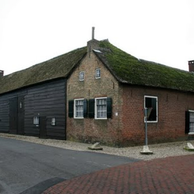 Goed bewaarde, eenvoudige BOERDERIJ, midden XIX, met hoog, rieten dak, dat woon- en bedrijfsgedeelte overdekt.