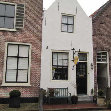 Pand met IJsselstenen puntgeveltje, oorspronkelijk trapgevel, met rode strekken boven de vensters (XVII-XVIII).