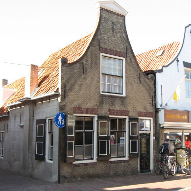 Pand met puntgevel, afgezet met een rollaag omstreeks 1800. Vensters, waarboven strekken van rode baksteen; schuiframen en deur uit de bouwtijd; bovenlicht met gietijzeren levensboom.
