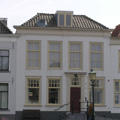 Vier traveeën breed PAND met gepleisterde gevel, schilddak en nieuwe dakkapel. Op de verdieping 6-ruits-schuifvensters. Beganegrond vensters met geprofileerde natuurstenen onderdorpels, en voordeuromlijsting met gecanneleerde pilasters. Hardstenen stoeptreden. XVIII.