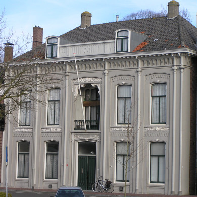 De bakstenen voorgevel, waarvan het risalerend middendeel wordt geflankeerd door veelhoekige pilasters, is geplaatst op natuurstenen voet, door cordonlijst horizontaal gedeeld en voorzien van attiek, plm 1870.