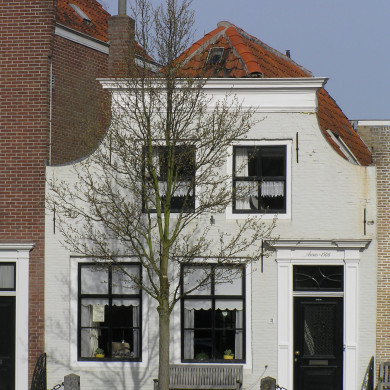 Huis met geverfde ingezwenkte lijstgevel. Staafankers. Voordeuromlijsting. XIX.