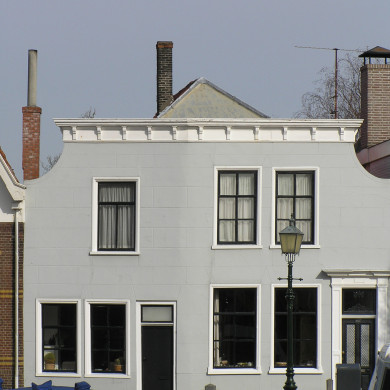 Huis met geverfde ingezwenkte lijstgevel. Staafankers. Voordeuromlijsting. XIX.