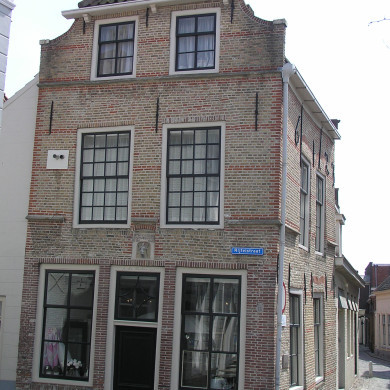 Hoekhuis met gesausde afgeknotte topgevel. Geprofileerde waterlijst en staafankers. Twee 24-ruitsvensters. Links een aanbouw. Zijgevel aan de Vlasmarkt met jaartalankers gedateerd 1623 en gevelsteen voorstellende St. Sebastiaan.