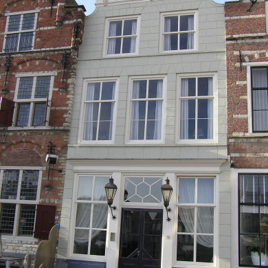 Museum. Laatgotisch huis 1533 met trapgevel van bak- en natuursteen met geprofileerde togen en cordonbanden. Gaaf voorbeeld van een geveltype, gekenmerkt door de overkraging der verdiepingen op bogen, die op kraagstenen tussen de vensters rusten.