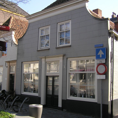 Gebosseerd gepleisterd pand (17e eeuw; gevel gewijzigd 1e helft 19e eeuw) met verdieping onder zadeldak gedekt met rode hollandse pannen, zesruitsschuifvensters op de begane grond, vierruits op verdieping; deur met bovenlicht; goot op geprofileerde klossen.