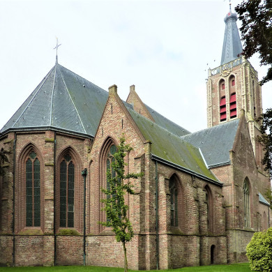 Ned.Herv.Kerk. Uit vroeg- en laatgotische delen bestaand gebouw. Als oudste deel geldt een rechtgesloten kapel aan de noordzijde van het koor, met merkwaardige venstertracering. De kapel van de kerk gescheiden door twee bogen, rustend op een kolom met kenmerken van de Scheldegotiek, midden 13e eeuw. Het bakstenen koor, voorbeeld van Vlaamse gotiek, 13e eeuw. 15e eeuws schip, oorspronkelijk driebeukig, plm 1500 gewijzigd en tot een beuk gemaakt.
