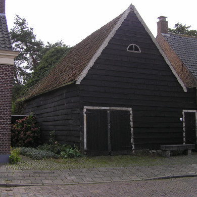 Zwart geteerde (XIX), gepotdekselde houten schuur met pannen zadeldak.