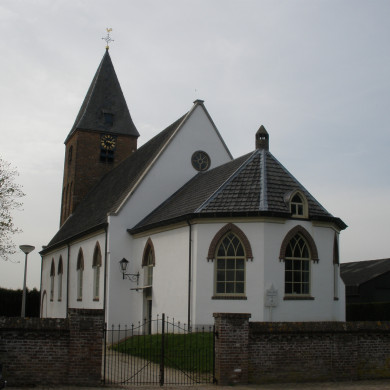 Toren der Herv. kerk. Sober, mogelijk 14e eeuws bouwwerk met drie spitsboognissen in ieder gevelvlak.