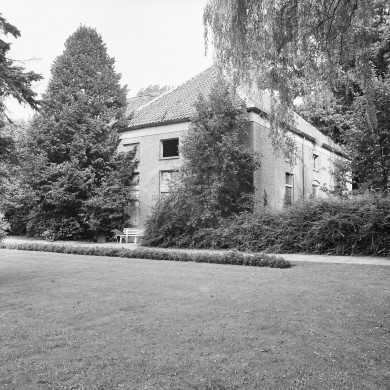 Fors gepleisterd gebouw bestaande uit twee rechthoekig op elkaar geplaatste vleugels; in de hoek tussen beide vleugels was voorheen een traptoren aanwezig. Voorgevel met middenpartij voorzien van pilasters en bekroond met fronton met wijzerplaat.