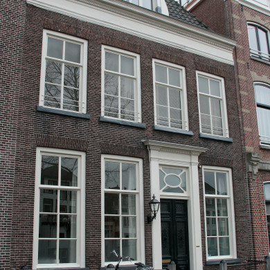 Patriciershuis (XVIII C). Kroonlijst met rococo-consoles, hardstenen plint, geprofileerde vensterdorpels, gesneden deur met verdiepte pilasters en bovenlicht, schuiframen uit de bouwtijd en uit XIX A. Stoep met palen en hekken. Hoekpand Nieuwsteeg.