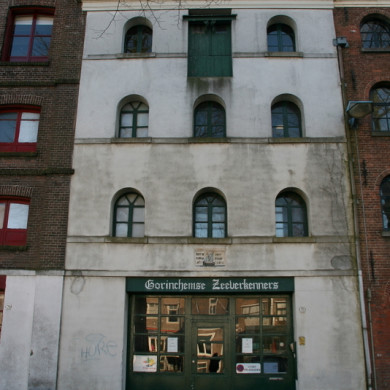 Pakhuis met gepleisterde gevel onder rechte lijst met getoogde vensters. Gevelsteen: "DIT IS INT KORNSCHIP" 1611.