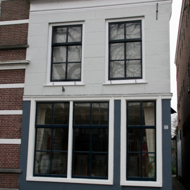 Hoekpand Blauwehaansteeg met gepleisterde lijstgevel (XIX A); geprofileerde puibalk en schuiframen uit de bouwtijd in de verdieping.