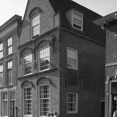 Huis met gepleisterde lijstgevel uit de eerste helft van de negentiende eeuw met aan de achterzijde puntgevel met ontlastingsbogen (zeventiende eeuw).