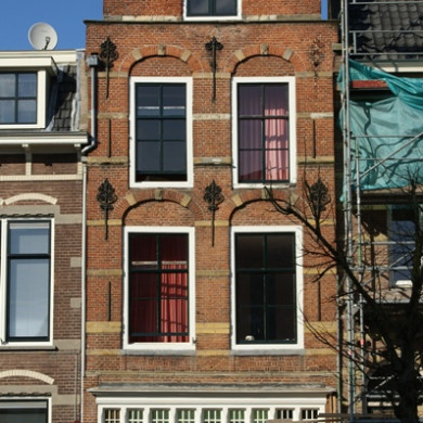 Hoekpand Botersteeg. Afgeknotte renaissance-trapgevel (XVII A) met natuurstenen banden, ontlastingsbogen van het Dordtse type op kraagstenen met binnen de bogen vlechtwerk. Muurankers. In de pui gesneden deuromlijsting (1844). Voorbeeld van XIXe eeuwse winkelpui.