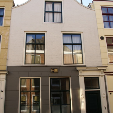 Burger Weeshuis. Pand onder schilddak, waarin twee dakvensters met vleugelstukken. Gepleisterde lijstgevel van vier vensterassen, gedateerd 1743. Hoekpilasters. Versierde deurtravee, Lod.
