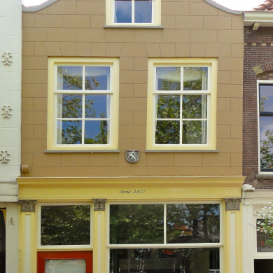 PAND met gevel met onder de kroonlijst rijk gesneden consoles, Lod.XIV. Gewijzigde pui, waarin mooie deur uit ca.1800.