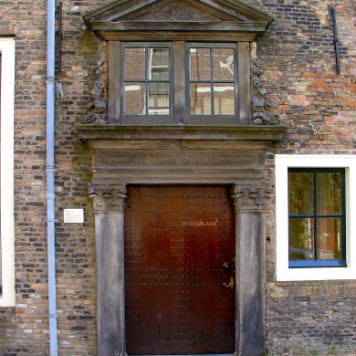 Links in de voorgevel een korfbogig, natuurstenen poortje (laat-gotisch) rechts een poortje tussen pilasters met Korintische kapitelen, waarboven venster met driehoekig fronton (gedateerd 1666) en gebeeldhouwde zijstukken met bloemen, vruchten en boeken.