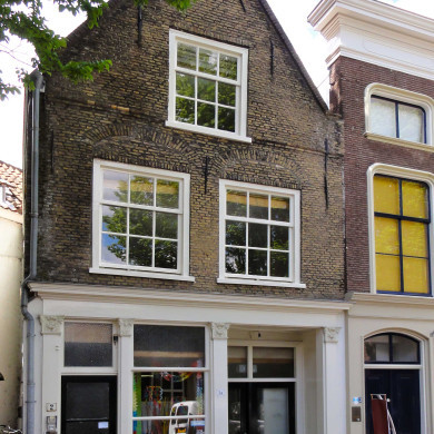 HOEKPAND Achter de Vismarkt. Gepleisterde, ingezwenkte lijstgevel, oorspronkelijk trapgevel.